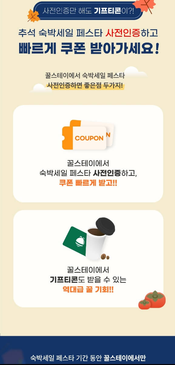 2024 대한민국 숙박세일페스타 추석편과 함께 꿀스테이에서 추가로 5가지 혜택을 더 드립니다. 숙박세일페스타의 쿠폰은 기본으로 사전인증 이벤트에 참여하는 사람들에게 스타벅스 커피 기프티콘과 4가지 추가 혜택이 있습니다.