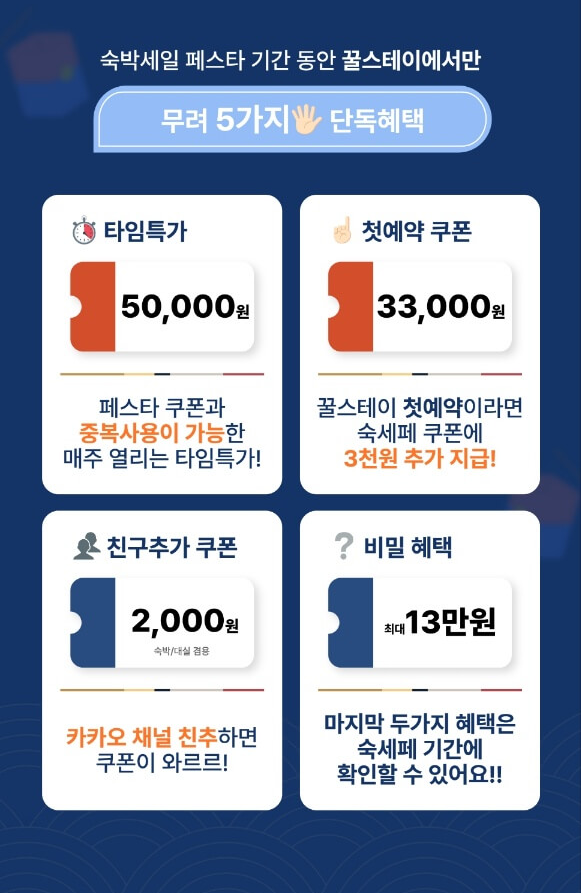 서울, 경기, 인천을 제외한 비수도권 지역의 숙소를 예약할 때, 최대 3만 원의 할인 쿠폰이 제공되어 국내여행 예산을 절약하는 데 큰 도움이 될 것입니다. 특히, 이번 행사에서는 꿀스테이에서 기본 3만 원 및 2만 원 쿠폰 외에도 추가 혜택이 5가지가 더 마련되어 있습니다.